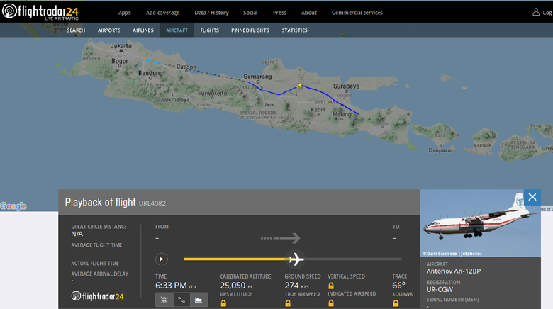 Dilihat detikcom di situs Flight Radar 24, pada pukul 05.40 PM UTC atau 00.40 WIB pesawat Antonov An-12BP dengan nomor registrasi UR-CGW melintas di langit Purwakarta, Jawa Barat pada ketinggian 15.350 kaki. Pesawat terdeteksi hingga sekitar langit Subang pada empat menit kemudian.