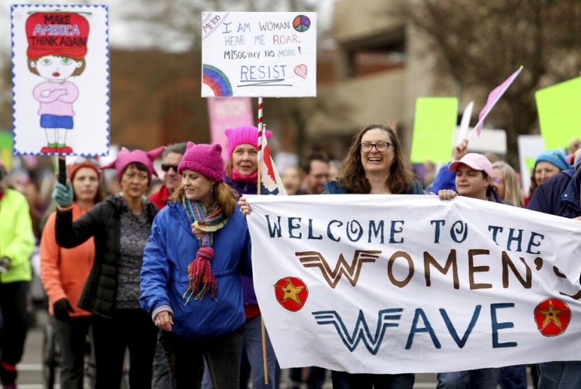 REPUBLIKA.CO.ID, WASHINGTON -- Perempuan turun ke jalan di ratusan kota di Amerika Serikat (AS), Sabtu (19/1). Aksi itu menandai peringatan kedua demonstrasi sehari setelah pelantikan Presiden dari partai Republik Donald Trump yang dilantik pada Januari 2017.
