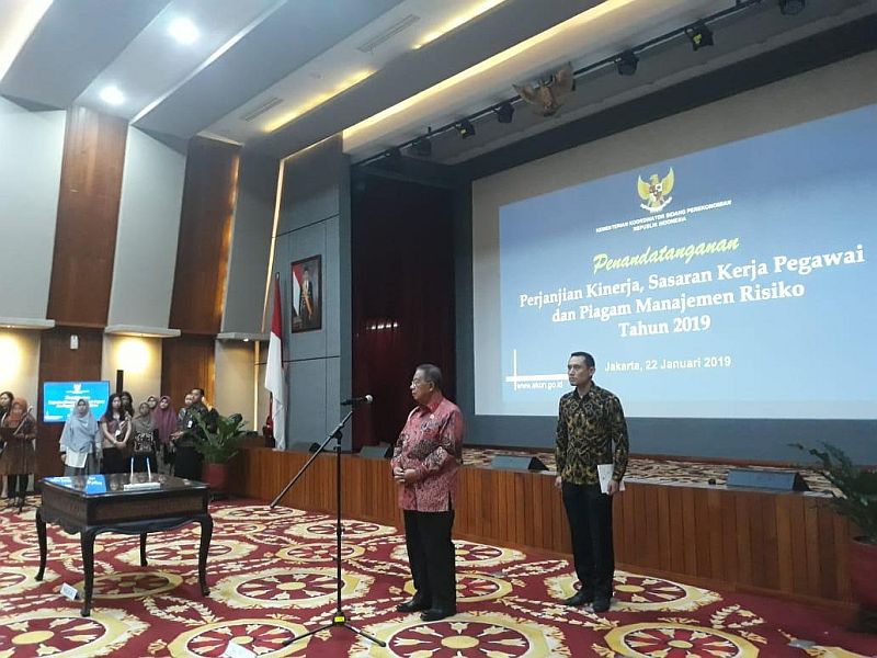 JAKARTA - Awal tahun 2019, Kementerian Koordinator bidang Perekonomian melakukan penandatanganan kontrak kerja. Penandatangan sendiri dilakukan oleh sejumlah pejabat eselon I dan II yang disaksikan langsung oleh Menteri Koordinator bidang Perekonomian Darmin Nasution.