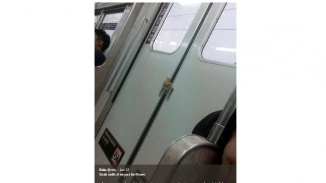 Akun Twitter yang bernama @ridu membagikan sebuah unggahan yang menampakkan gorengan terjepit di pintu kereta komuter.