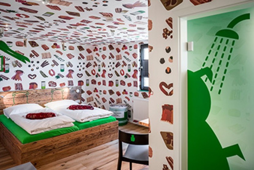 Desain interior hotel tersebut bertemakan sosis. Pada wallpaper dinding terdapat gambar sosis, bantal berbentuk sosis di tempat tidur dan juga sosis jenis bratwurst yang tergantung di langit-langit kamar. Bahkan sabun yang digunakan terlihat seperti sosis.