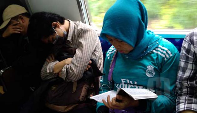 Muslimah berjilbab tersebut tetap mengaji dalam perjalanannya di atas kereta rangkaian listrik (KRL) dalam perjalanan dari Depok ke Jakarta baru-baru ini.